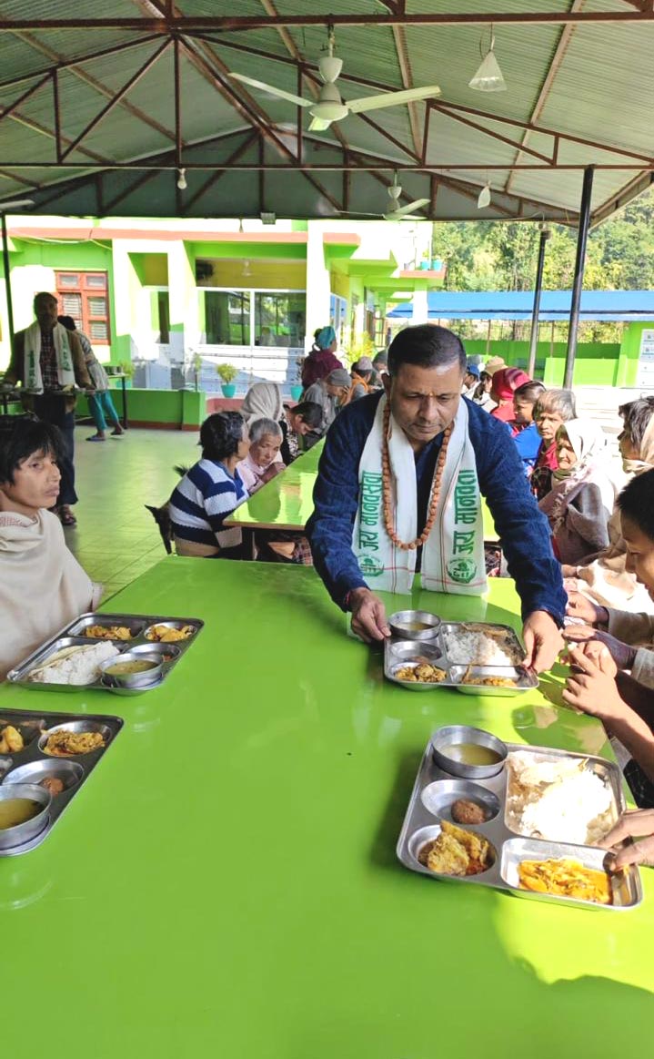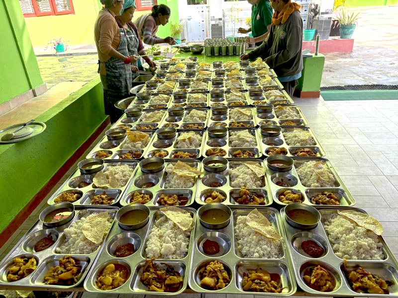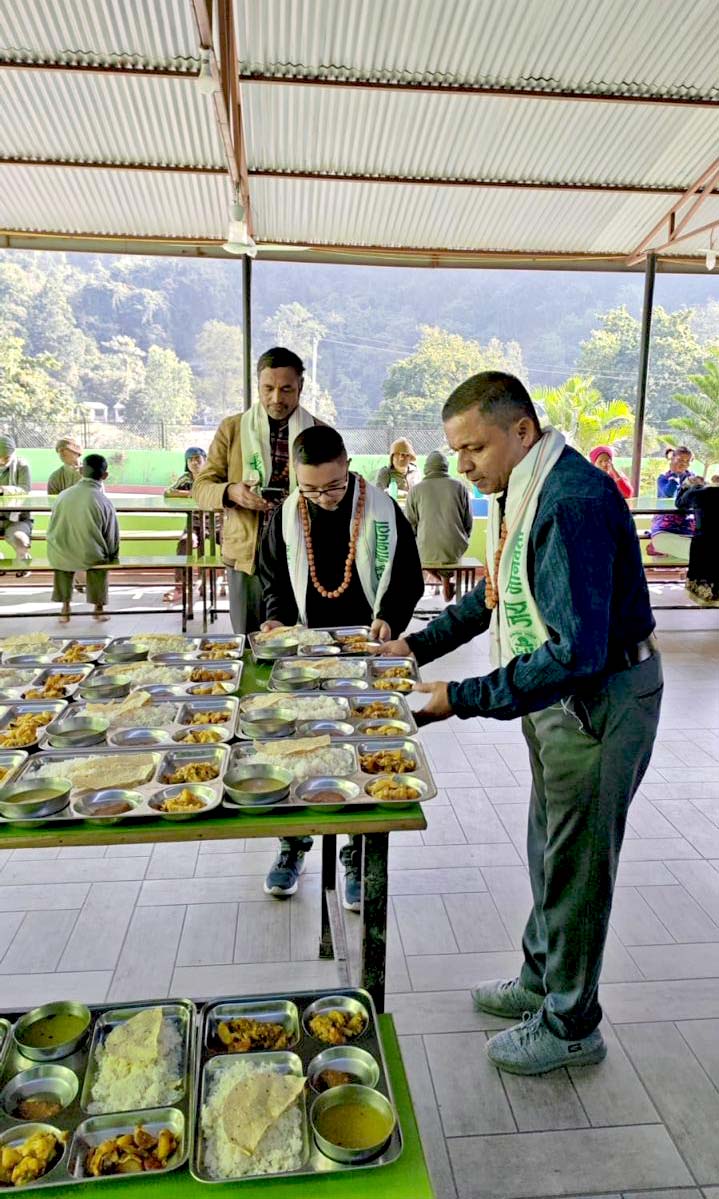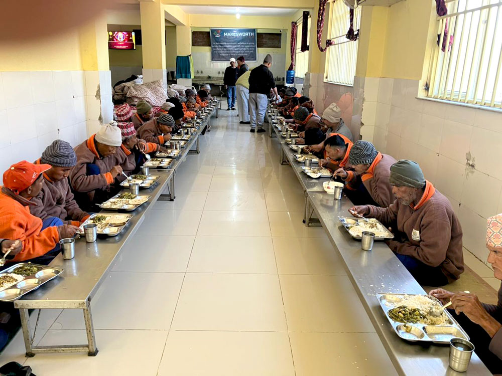 Feeding a group of elderly and disabled people in Padma Bhuwaneshwori Namuna Briddha Sewa Ashram